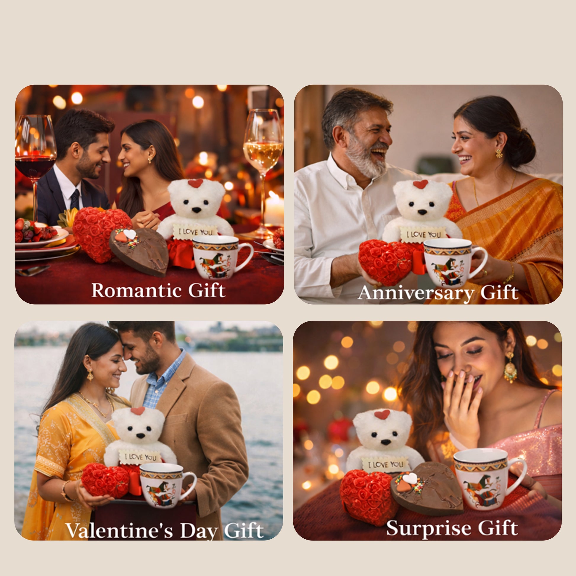 • Complete Valentine Gift Set Includes teddy bear, ceramic mug, chocolates, heart décor & premium gift box.